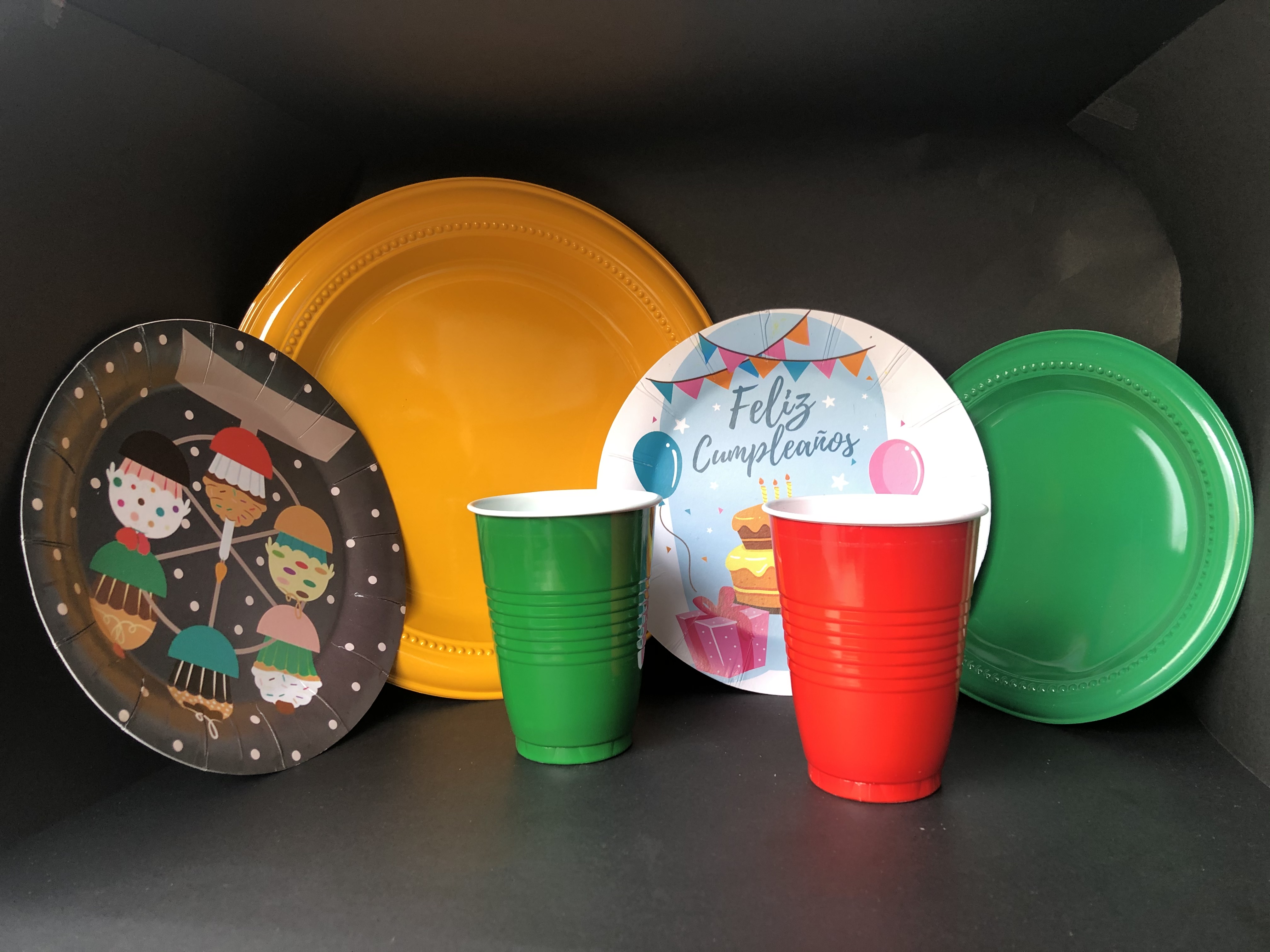 Descripción: Platos, vasos y cubiertos de colores, para cumpleaños, reuniones y agasajos